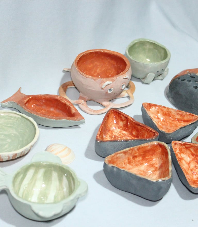 Además, abrimos un espacio para la creación de objetos utilitarios como pocillos, platos y tazas, trabajados con procesos manuales sin máquina: modelado a pellizco y uso de matrices sencillas que permiten controlar las formas durante el proceso. De esta manera, los talleres integran tanto lo sonoro como lo cotidiano, mostrando la versatilidad del barro en la vida cultural y práctica.